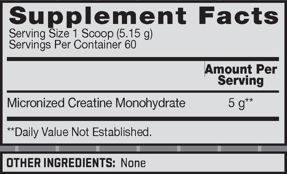 Just pure, micronized Creatine Monohydrate. Nothing more, nothing less. BSN Creatine supports strength, power, and lean body mass without any fillers or additives. One serving provides 5 grams of Creatine Monohydrate to help you perform your best and show off your hard-earned work. Because when the world is your stage, you never stop performing.