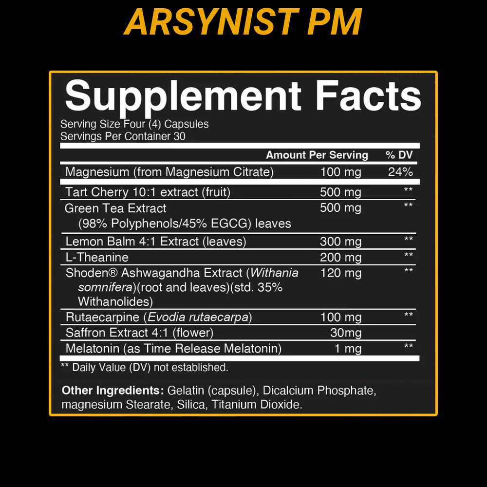 At night, Arsynist PM steps in to provide support for restful sleep while continuing to complement your wellness routine. Featuring natural ingredients like Tart Cherry and Green Tea Extract, this supplement is designed to help you relax and wake up feeling refreshed, without disrupting your body's natural balance. Added Ashwagandha may also help with relaxation and stress management as part of your healthy lifestyle.