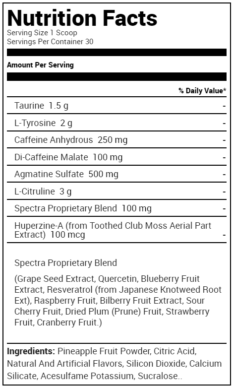 Boasting an impressive list of ingredients in an all open panel (that’s right, no proprietary blends here), White warped includes Citrulline, Agmatine, Taurine, Tyrosine, Huperzine A, Caffeine (as anhydrous and dicaffeine malate), and Spectra™, a brand-new patented ingredient.