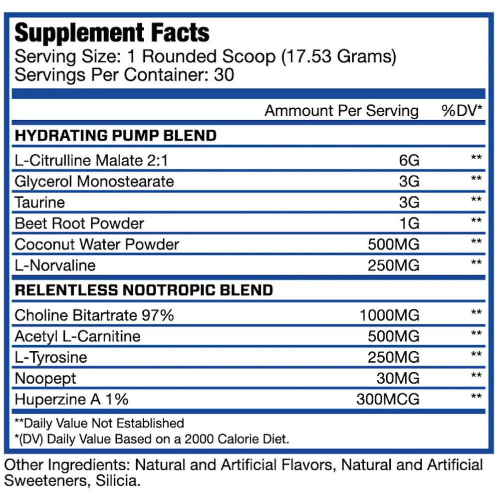 The Pump Blend consists of 6g Citrulline Malate 2:1, 3g Glycerol Monostearate, 3g Taurine, & 250mg L-Norvaline. The pump from this product is explosive to say the least. Your muscles will have more blood in them than they ever have before.