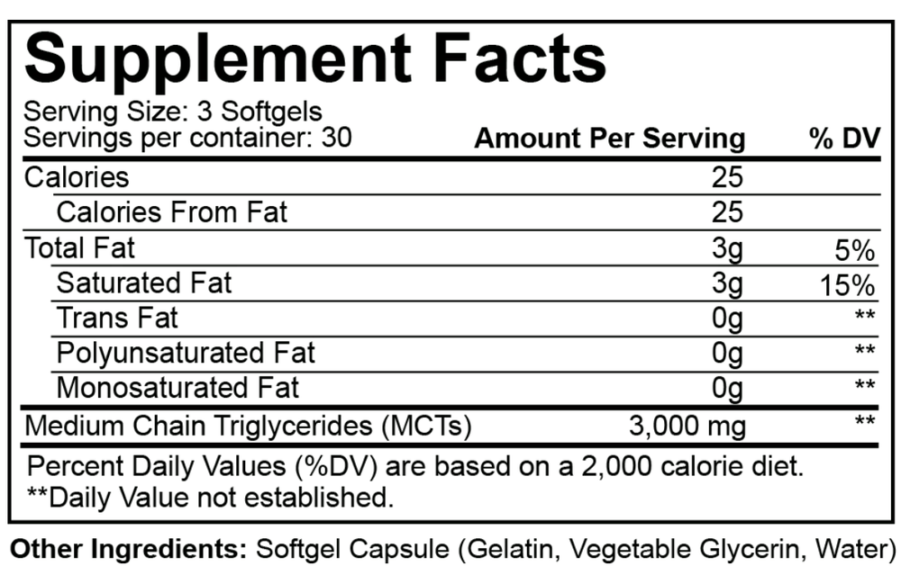 Medium Chain Triglycerides (MCTs) are a source of clean fuel for the body. MCTs can be found naturally in Coconut Oil, Palm Kernel Oil, and various dairy products. Supplementing with MCT Oil can provide a healthy source of energy for metabolism, and is especially useful for calorie restricted diets.