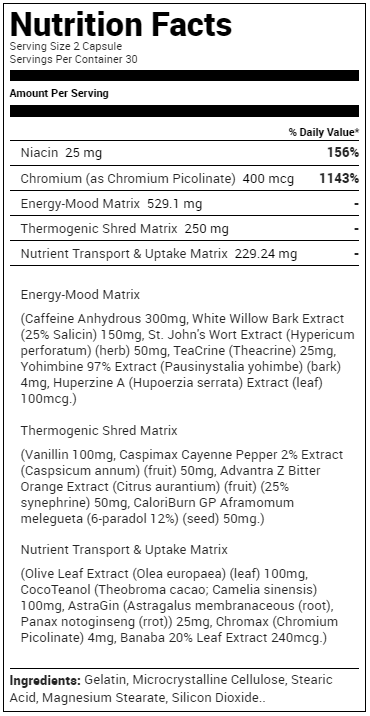Rev up the shredder because Vanish® is about to help you get ripped. ProSupps® Vanish® is the most complete, fully loaded thermogenic capsule available, delivering intense yet focused energy, increased caloric burn and improved metabolic activity. Featuring three powerful matrices, each loaded with ingredients that stimulate the key metabolic pathways involved in promotion of fat reduction. This all-in-one metabolism-boosting bomb, boosts energy, reduces hunger and will give you the focus to crush your body composition goals.