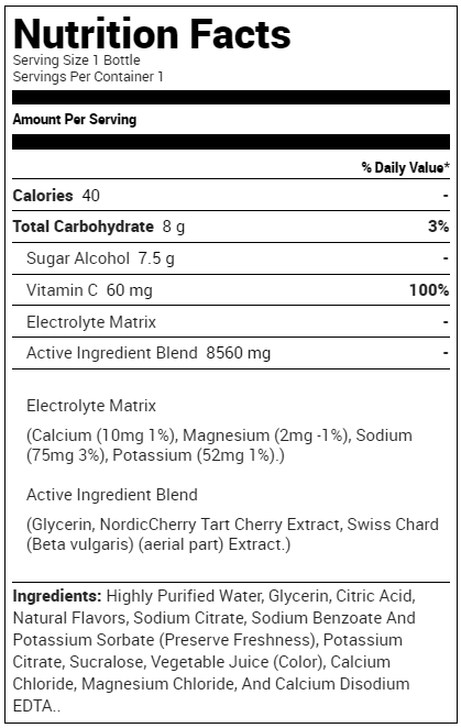 Powered By NordicCherry. Supports Muscle Recovery. Supports Nutrient Delivery Post-Exercise. Reduces Muscle Soreness. Cherry Blast Is Infused With Key Bioactive Compounds, Derived From Tart NordicCherry Deigned To Reduce Muscle Soreness And Improve Performance. Cherry Blast Also Contains Swiss Chard, Which Provides Powerful Anti-Oxidants To Naturally Increase Blood Flow And Increase Nutrient Transport. Cherry Blast Is Also Packed With Potent Electrolytes And Glycerin To Optimize Muscle Function, Hydration, And Performance!